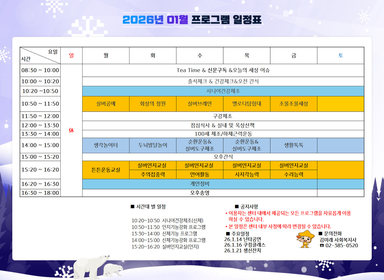 은평케어센터 [프로그램 안내] 2026년 은평케어센터 1월 프로그램 일정표 페이지 정보 작성자 최고관리자 댓글 0건 조회 737회 작성일 26-01-06 10:32 목록 본문 2026년 은평케어센터 1월 프로그램 일정표입니다. 목록 이전글[하루의식단] 2026년 1월 6일 26.01.07 다음글[프로그램 안내] 2026년 위례케어센터 1월 프로그램 일정표 26.01.05