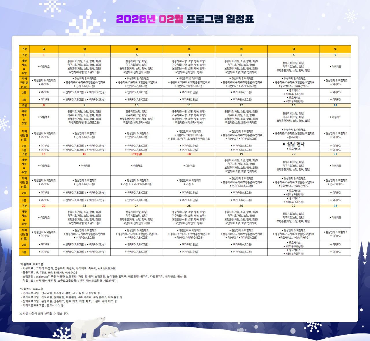 서초빌리지 [프로그램 안내] 2026년 서초 빌리지 2월 프로그램 일정표 페이지 정보 작성자 최고관리자 댓글 0건 조회 594회 작성일 26-01-30 14:22 목록 본문 목록 이전글[프로그램 안내]2026년 강동 케어센터 2월 프로그램 일정표 26.01.30 다음글[프로그램 안내]2026년 강동 빌리지 2월 프로그램 일정표 26.01.30