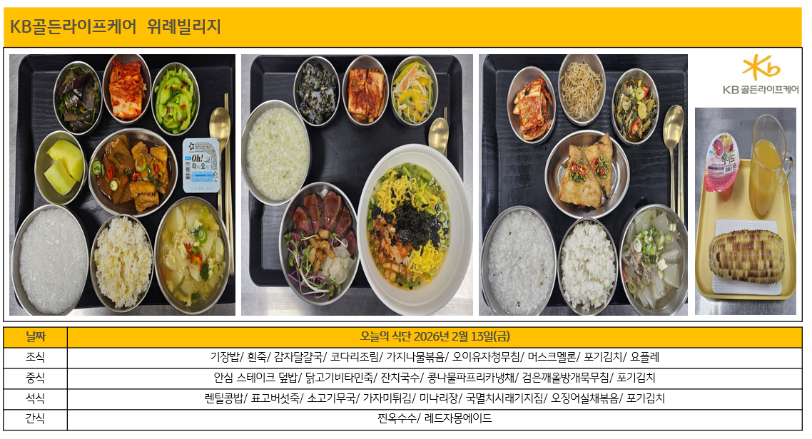위례빌리지 [하루의 식단] 2026년 2월 13일 페이지 정보 작성자 최고관리자 댓글 0건 조회 26회 작성일 26-02-13 17:37 목록 본문 목록 이전글[식단안내] 2026년 2월 3주차 식단표 26.02.14 다음글[식단안내] 서초빌리지 2월 3주차 식단표 26.02.13