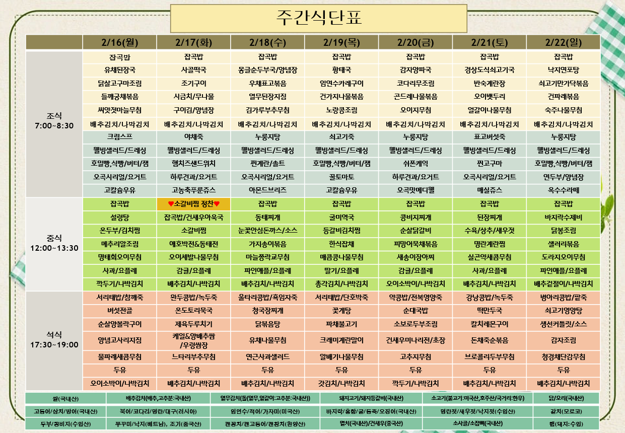 평창카운티 [식단안내] 2026년 2월 3주차 식단표 페이지 정보 작성자 최고관리자 댓글 0건 조회 20회 작성일 26-02-14 11:03 목록 본문 목록 이전글[하루의식단] 2026년 2월 13일 조/중/석식 26.02.14 다음글[하루의 식단] 2026년 2월 13일 26.02.13