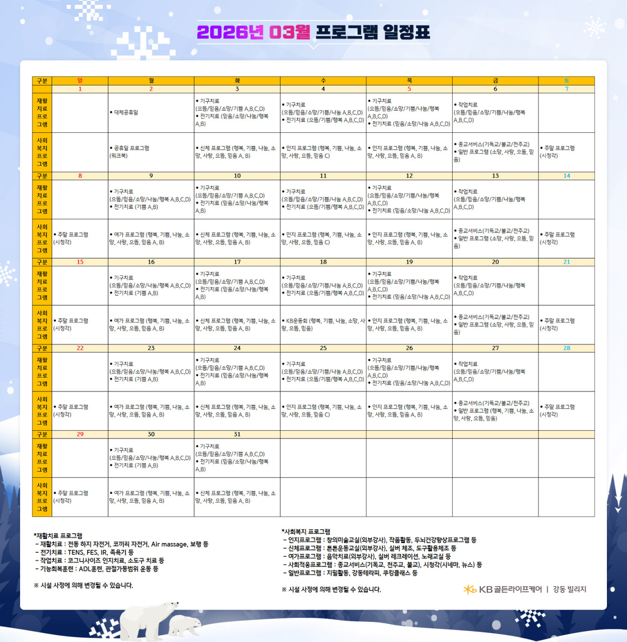 강동빌리지 [프로그램 안내]2026년 강동 빌리지 3월 프로그램 일정표 페이지 정보 작성자 최고관리자 댓글 0건 조회 1,048회 작성일 26-02-25 09:48 목록 본문 목록 이전글[하루의 식단] 2026년 2월 25일 26.02.25 다음글[식단안내] 2026년 2월 4주차 식단표 26.02.22