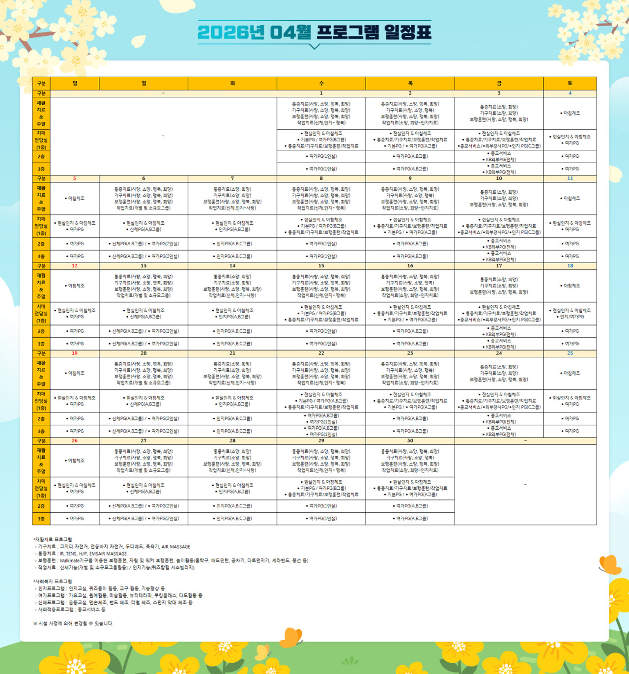 서초빌리지 [프로그램 안내] 2026년 서초 빌리지 4월 프로그램 일정표 페이지 정보 작성자 최고관리자 댓글 0건 조회 222회 작성일 26-03-27 11:22 목록 본문 목록 이전글[프로그램 안내] 2026년 은평 빌리지 4월 프로그램 일정표 26.03.27 다음글[식단안내] 2026년 4월 1주차 식단표 26.03.26