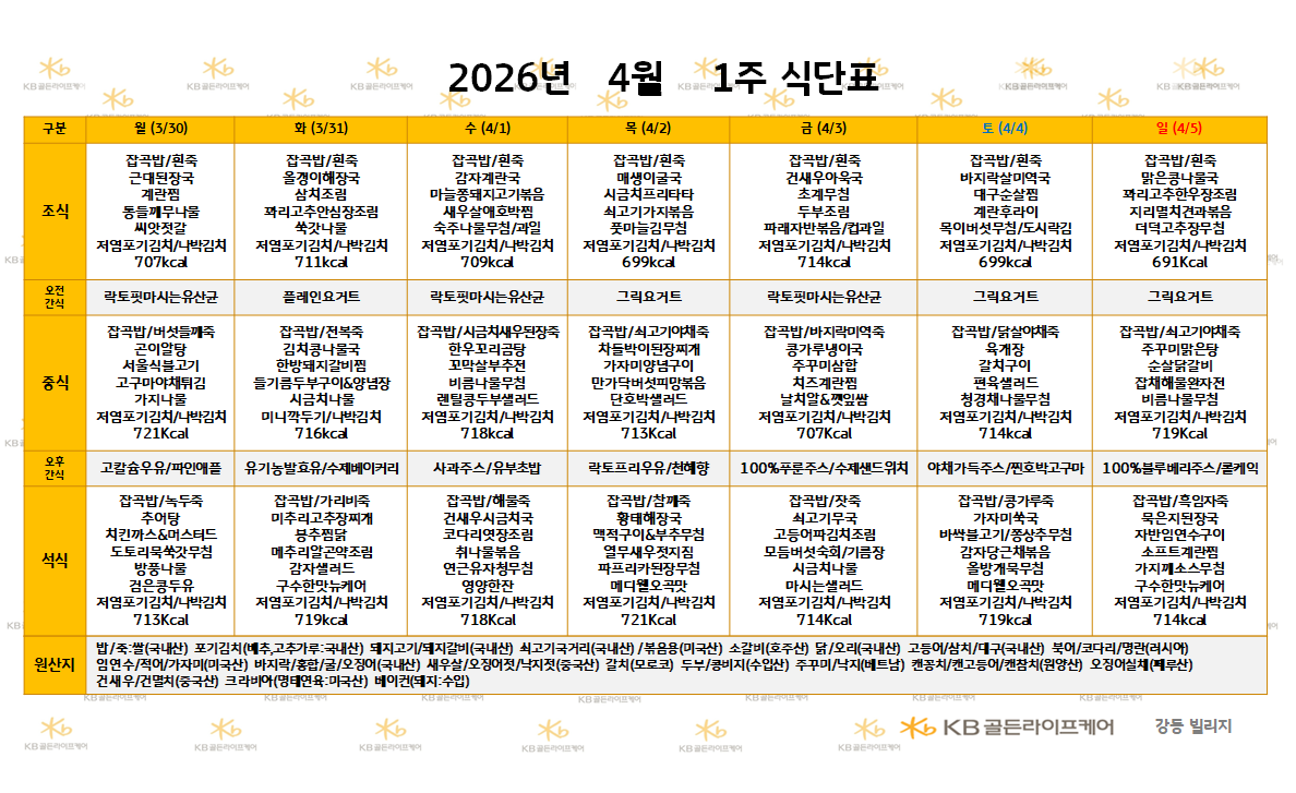 강동빌리지 [식단안내] 2026년 4월 1주 식단표 페이지 정보 작성자 최고관리자 댓글 0건 조회 30회 작성일 26-03-30 10:16 목록 본문 목록 이전글[하루의 식단]강동빌리지 3월 27일 금요일 26.03.30 다음글[식단안내] 2026년 4월 1주차 식단표 26.03.30