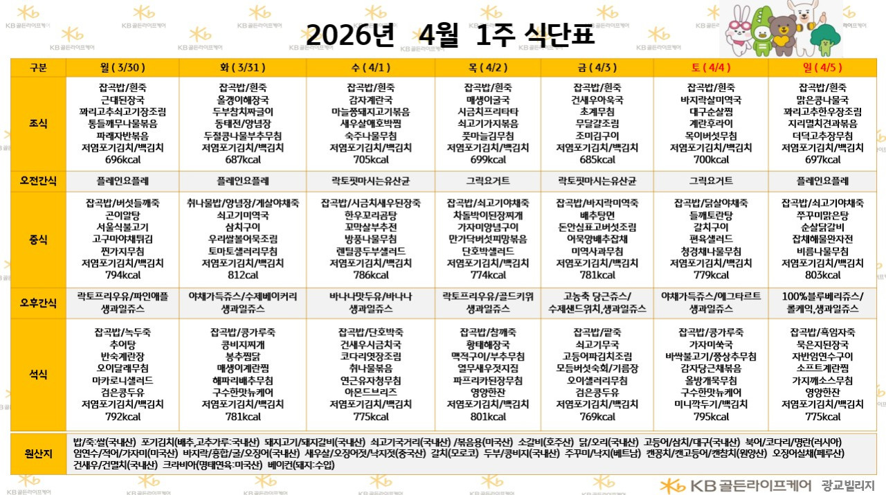 광교빌리지 [식단안내] 2026년 4월 1주차 식단표 페이지 정보 작성자 최고관리자 댓글 0건 조회 63회 작성일 26-03-30 14:58 목록 본문 목록 이전글[하루의 식단] 2026년 3월 24일 하루식단 26.03.30 다음글2026년 광교빌리지 4월 프로그램 일정표 26.03.30