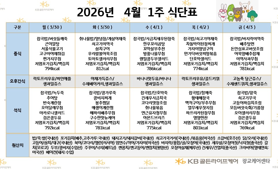 광교케어센터 [식단안내] 2026년 4월 1주 식단표 페이지 정보 작성자 최고관리자 댓글 0건 조회 19회 작성일 26-03-30 15:04 목록 본문 목록 이전글[오늘의 식단] 26년 3월 27일 금요일 중식 26.03.30 다음글[하루의 식단] 2026년 3월 24일 하루식단 26.03.30