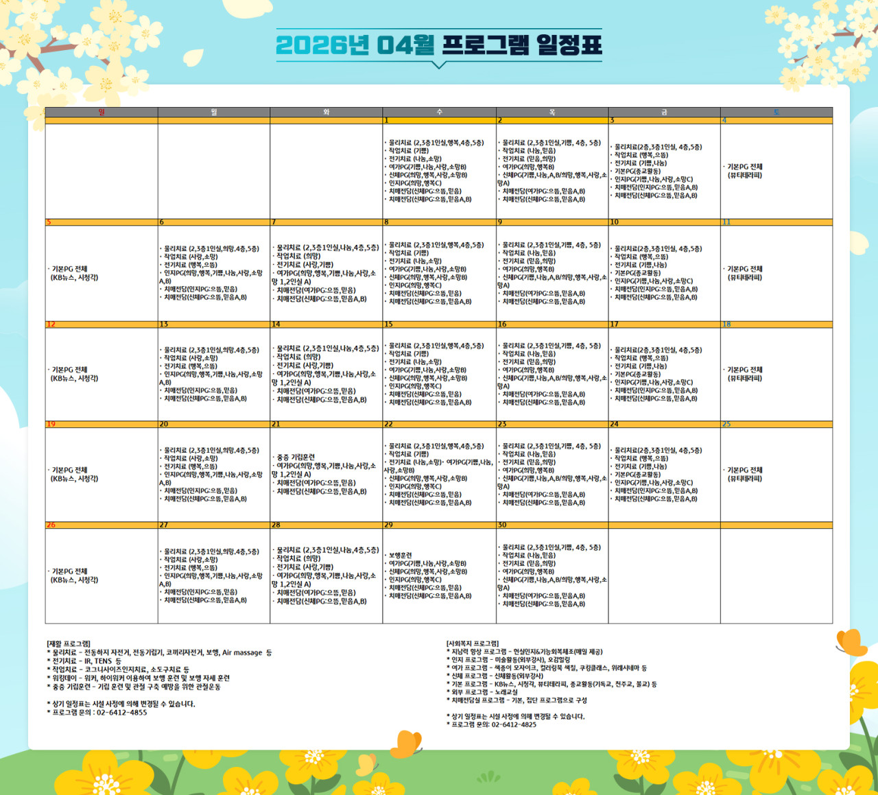 위례빌리지 [프로그램 안내]2026년 위례 빌리지 4월 프로그램 일정표 페이지 정보 작성자 최고관리자 댓글 0건 조회 56회 작성일 26-03-31 09:07 목록 본문 목록 이전글[프로그램 안내] 2026년 은평 케어센터 4월 프로그램 일정표 26.03.31 다음글[프로그램 안내]2026년 강동 케어센터 4월 프로그램 일정표 26.03.30