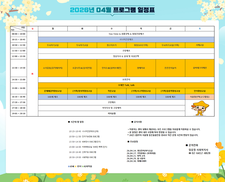 위례케어센터 [프로그램 안내] 2026년 위례케어센터 4월 프로그램 일정표 페이지 정보 작성자 최고관리자 댓글 0건 조회 10회 작성일 26-04-02 09:44 목록 본문 목록 이전글[식단안내] 2026년 4월 2주차 식단표 26.04.02 다음글[프로그램 안내] 2026년 강동 빌리지 4월 프로그램 일정표 26.03.31