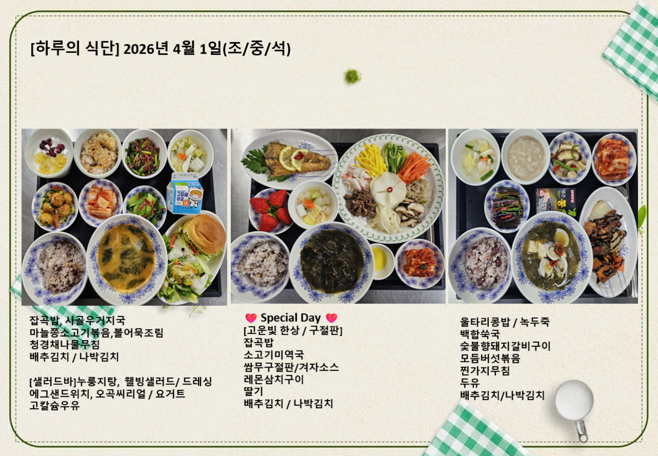 평창카운티 [하루의 식단] 2026년 4월 1일 (조/중/석) 페이지 정보 작성자 최고관리자 댓글 0건 조회 210회 작성일 26-04-04 13:31 목록 본문 목록 이전글[식단안내] 2026년 4월 2주차 식단표 26.04.04 다음글[식단안내] 2026년 4월 2주 식단표 26.04.03