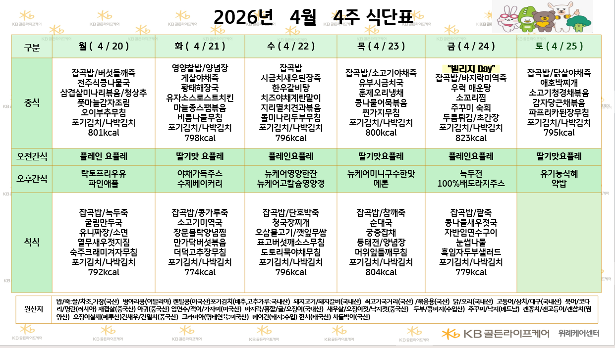 위례케어센터 [식단안내] 2026년 4월 4주차 식단표 페이지 정보 작성자 최고관리자 댓글 0건 조회 13회 작성일 26-04-17 09:32 목록 본문 목록 이전글[식단안내] 2026년 4월 4주차 식단표 26.04.17 다음글[하루의 식단] 2026년 4월 15일 (조/중/석) 26.04.15