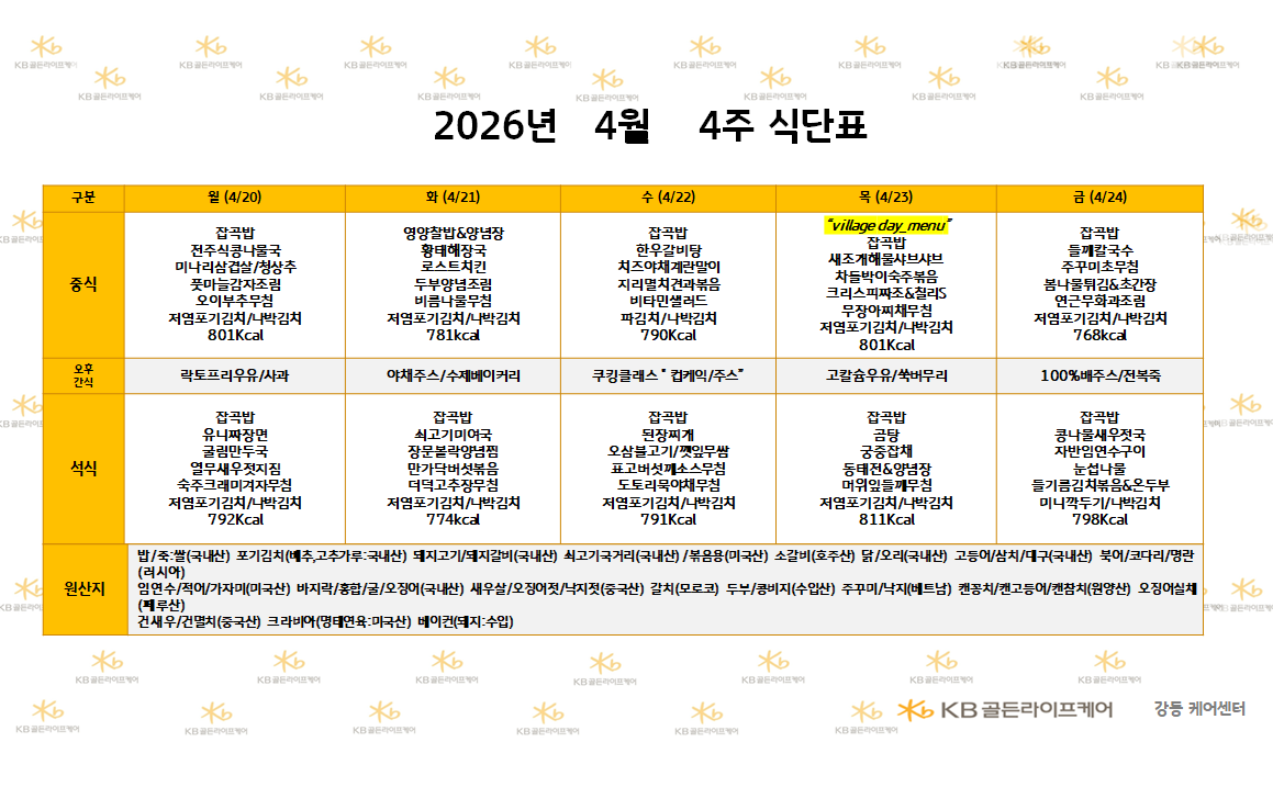 강동케어센터 [식단안내] 2026년 4월 4주 식단표 페이지 정보 작성자 최고관리자 댓글 0건 조회 14회 작성일 26-04-17 16:31 목록 본문 목록 이전글[하루의 식단]강동빌리지 4월 16일 목요일 26.04.17 다음글[식단안내] 2026년 4월 4주 식단표 26.04.17