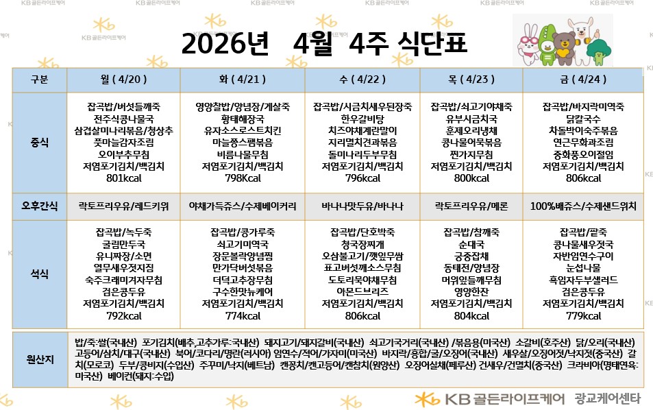 광교케어센터 [식단안내] 2026년 4월 4주 식단표 페이지 정보 작성자 최고관리자 댓글 0건 조회 49회 작성일 26-04-17 18:35 목록 본문 목록 이전글[식단안내] 2026년 4월 4주차 식단표 26.04.18 다음글[하루의 식단] 2026년 4월 16일 하루식단 26.04.17
