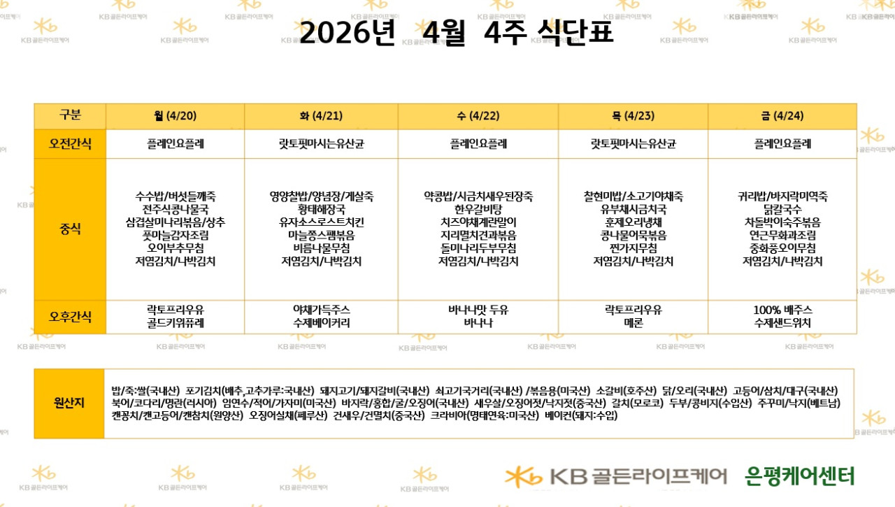 은평케어센터 [식단안내] 2026년 4월 4주차 식단표 페이지 정보 작성자 최고관리자 댓글 0건 조회 33회 작성일 26-04-18 09:31 목록 본문 목록 다음글[오늘의식단] 2026년 4월 14일 중식 26.04.18