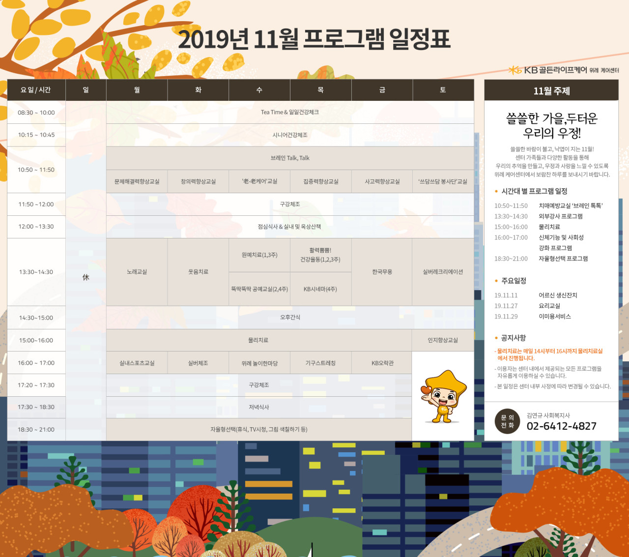 위례케어센터 [프로그램 안내] 2019년 위례케어센터 11월 프로그램 일정표 페이지 정보 작성자 KB 골든라이프 댓글 0건 조회 3,586회 작성일 19-11-08 17:56 목록 본문 목록 이전글[식단안내] 위례 빌리지 11월 4주차 식단표 19.11.15 다음글[식단안내] 위례 데이케어 11월 3주차 식단표 19.11.08