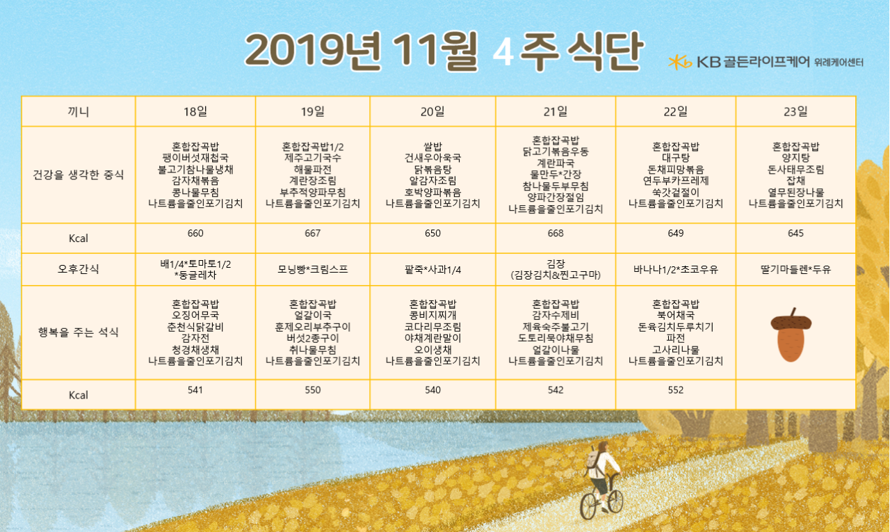 위례케어센터 [식단안내] 위례 케어센터 11월 4주차 식단표 페이지 정보 작성자 KB 골든라이프 댓글 0건 조회 3,479회 작성일 19-11-15 14:04 목록 본문 목록 이전글[식단안내] 위례 빌리지 11월 5주차 식단표 19.11.23 다음글[식단안내] 위례 빌리지 11월 4주차 식단표 19.11.15