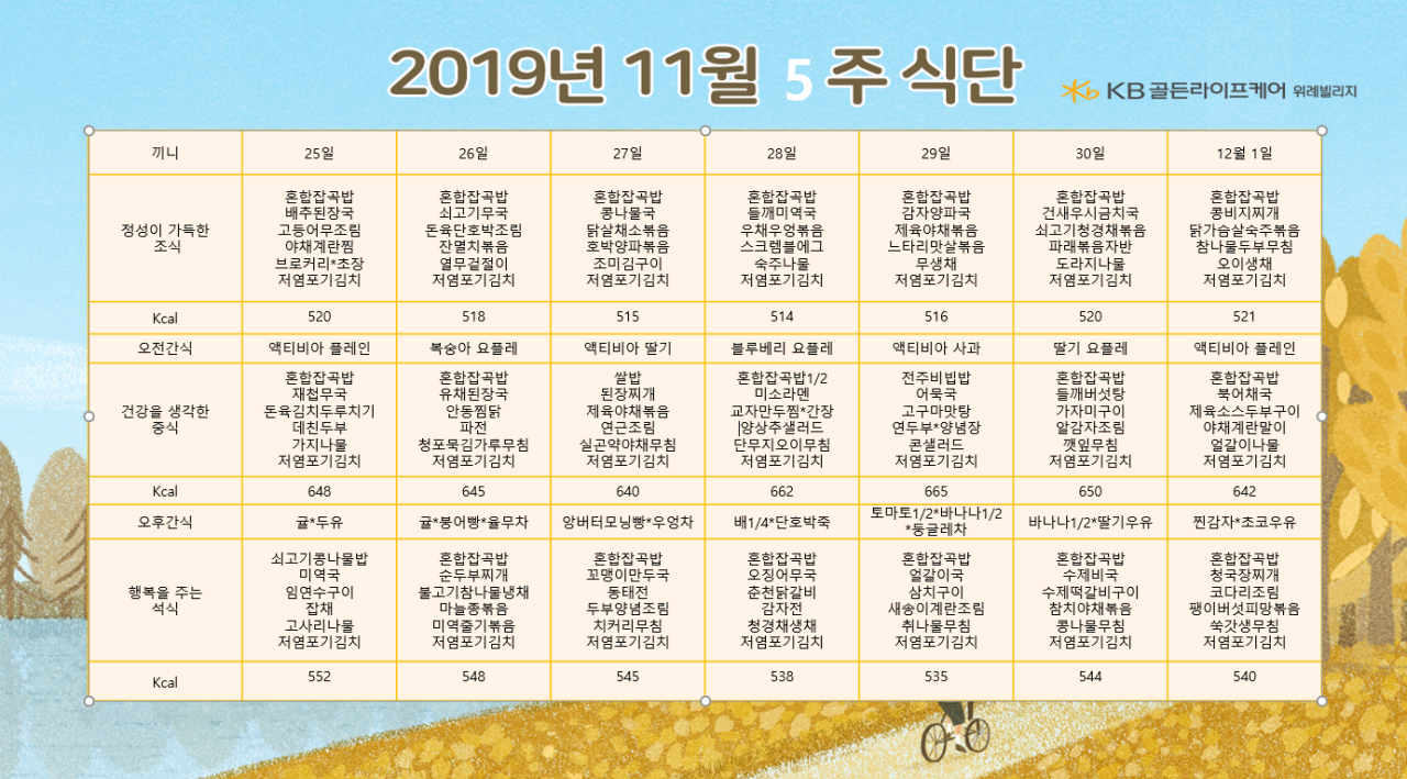 위례빌리지 [식단안내] 위례 빌리지 11월 5주차 식단표 페이지 정보 작성자 KB 골든라이프 댓글 0건 조회 3,077회 작성일 19-11-23 14:23 목록 본문 목록 이전글[식단안내] 위례 데이케어 11월 5주차 식단표 19.11.23 다음글[식단안내] 위례 케어센터 11월 4주차 식단표 19.11.15