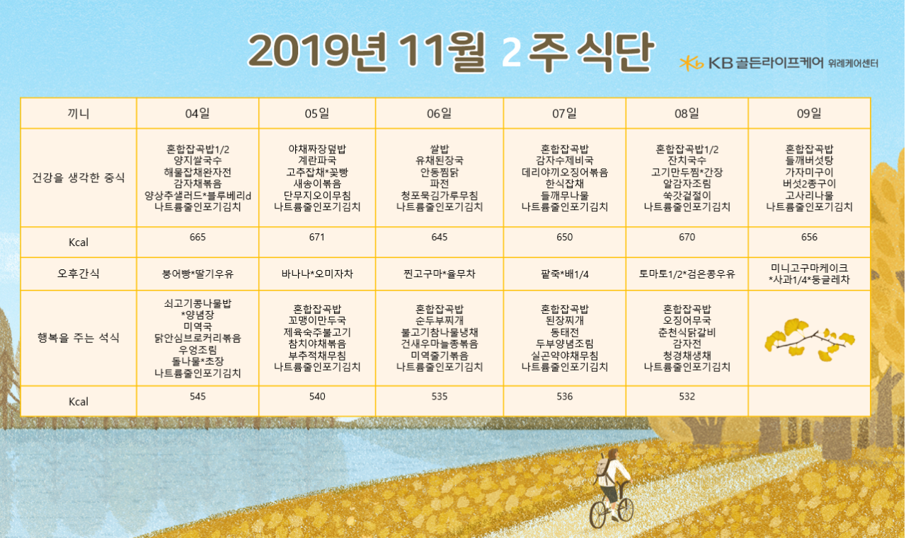 위례빌리지 [식단안내] 위례 데이케어 11월 1주차 식단표 페이지 정보 작성자 KB 골든라이프 댓글 0건 조회 2,802회 작성일 19-11-01 17:44 목록 본문 목록 이전글[식단안내] 위례 빌리지 11월 1주차 식단표 19.11.01 다음글[프로그램 안내] 2019년 위례 빌리지 11월 프로그램 일정표 19.11.01