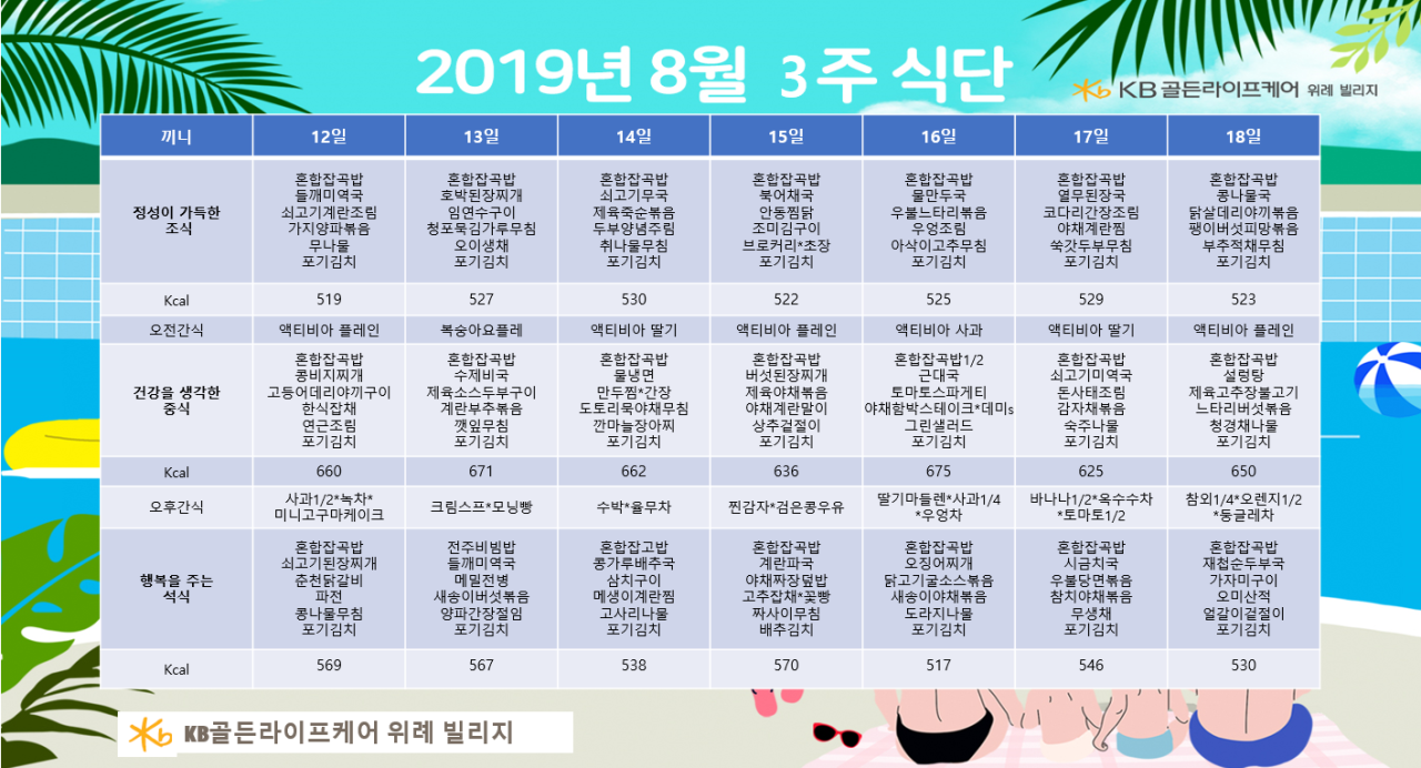 위례빌리지 [식단안내] 위례 빌리지 8월 3주차 식단표 페이지 정보 작성자 KB 골든라이프 댓글 0건 조회 2,938회 작성일 19-08-09 17:34 목록 본문 목록 이전글[식단안내] 위례 케어센터 8월 3주차 식단표 19.08.09 다음글[식단안내] 위례 케어센터 8월 2주차 식단표 19.08.02