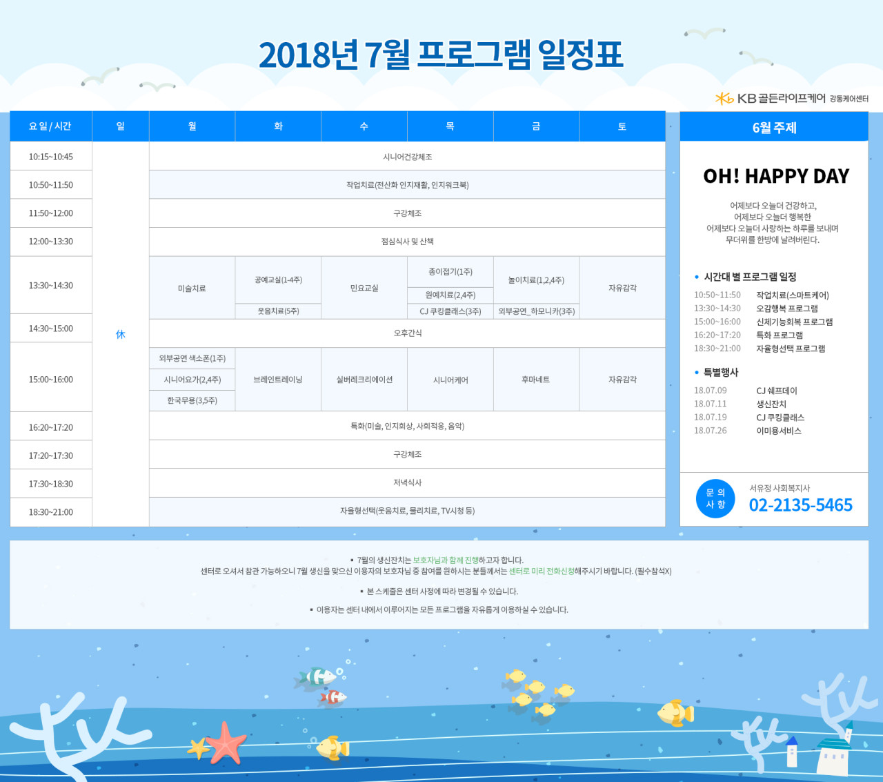 강동케어센터 [프로그램 안내] 2018년 7월 프로그램 스케줄 페이지 정보 작성자 KB 골든라이프 댓글 0건 조회 3,242회 작성일 18-07-02 18:48 목록 본문 목록 이전글[식단안내] 2018년 8월 식단표 18.08.03 다음글[식단안내] 2018년 7월 식단표 18.07.02