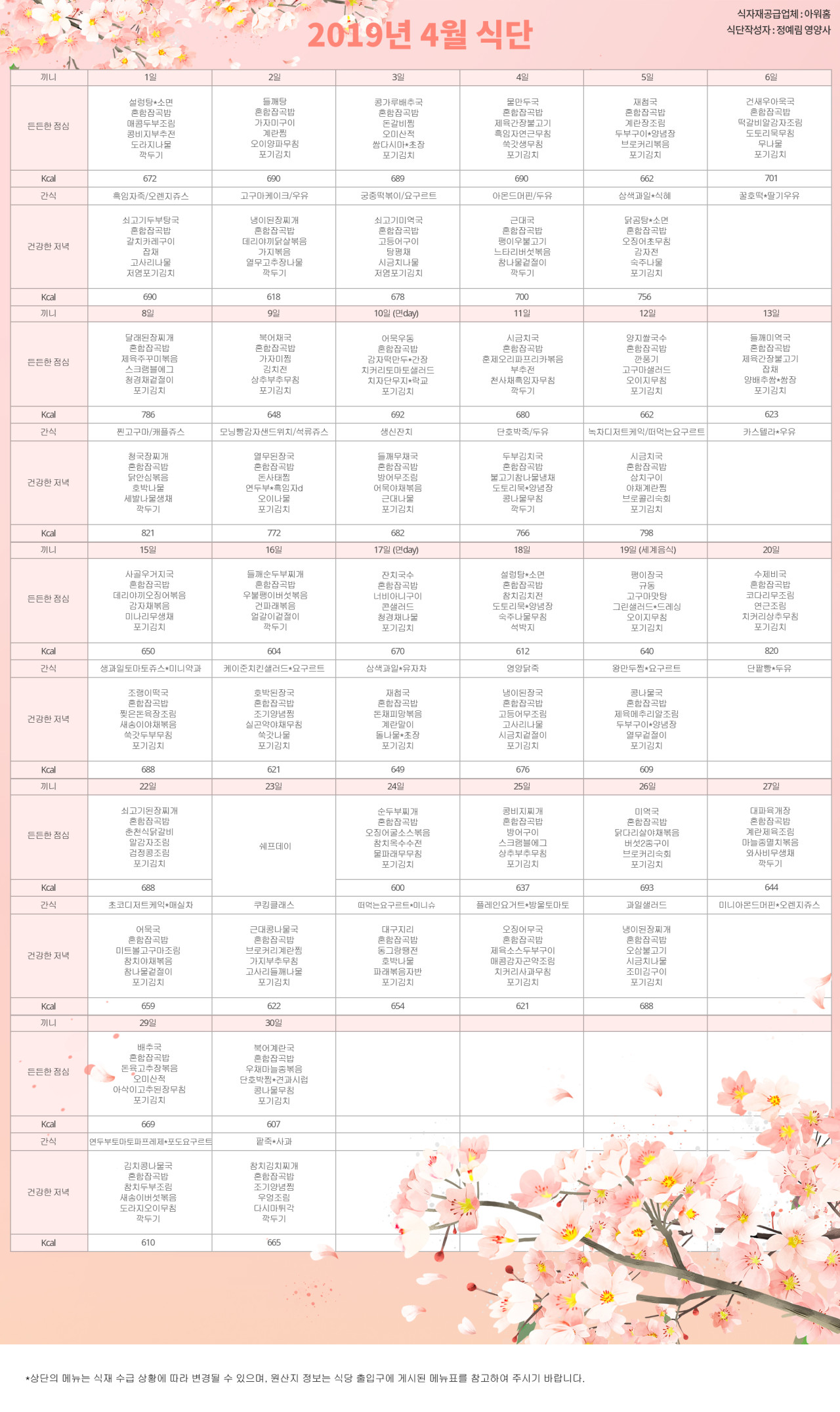 강동케어센터 [식단안내] 2019년 4월 식단표 페이지 정보 작성자 KB 골든라이프 댓글 0건 조회 4,447회 작성일 19-04-02 14:45 목록 본문 목록 이전글[재무공시]제3기 재무상태표 19.04.09 다음글[프로그램 안내] 2019년 4월 프로그램 스케줄 19.04.02