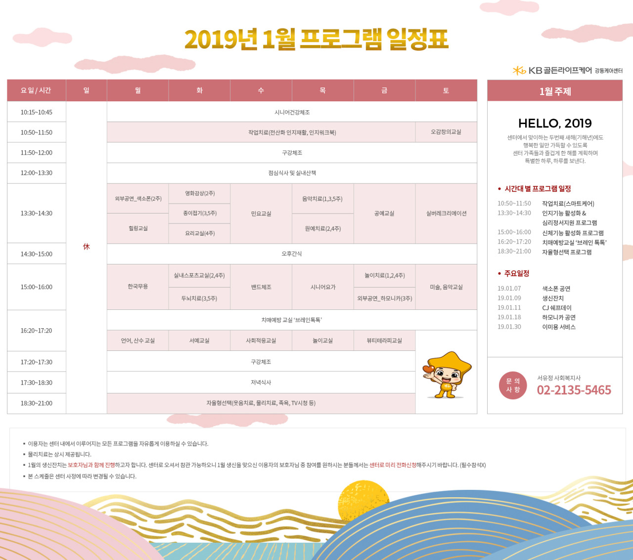 강동케어센터 [프로그램 안내] 2019년 1월 프로그램 스케줄 페이지 정보 작성자 KB 골든라이프 댓글 0건 조회 3,384회 작성일 19-01-10 11:57 목록 본문 목록 이전글[식단안내] 2019년 1월 식단표 19.01.10 다음글『KB골든라이프빌리지』 위례의 생활 및 사무가전 납품 업체 선정을 위한 입찰 공고 19.01.07