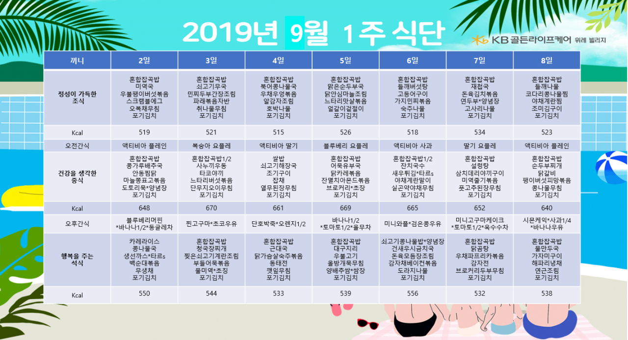 위례빌리지 [식단안내] 위례 빌리지 9월 1주차 식단표 페이지 정보 작성자 KB 골든라이프 댓글 0건 조회 2,393회 작성일 19-08-30 16:13 목록 본문 목록 이전글[식단안내] 위례 케어센터 9월 1주차 식단표 19.08.30 다음글[식단안내] 강동케어센터 2019년 9월 식단표 19.08.26