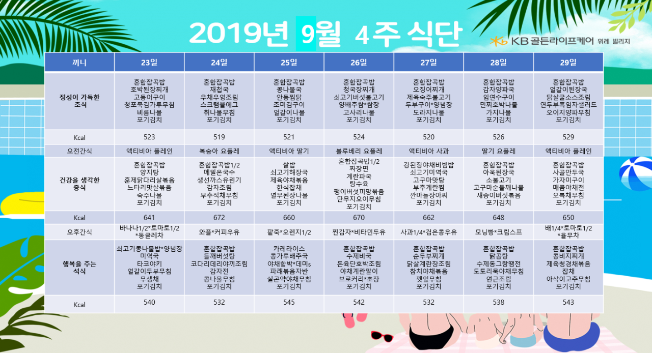위례빌리지 [식단안내] 위례 빌리지 9월 4주차 식단표 페이지 정보 작성자 KB 골든라이프 댓글 0건 조회 2,572회 작성일 19-09-20 15:42 목록 본문 목록 이전글[식단안내] 위례 케어센터 9월 4주차 식단표 19.09.20 다음글[식단안내] 위례 빌리지 9월 3주차 식단표 19.09.13