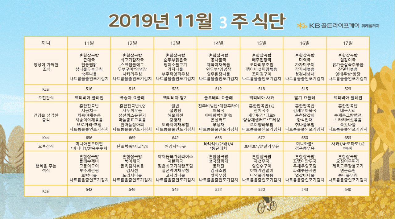 위례빌리지 [식단안내] 위례 빌리지 11월 3주차 식단표 페이지 정보 작성자 KB 골든라이프 댓글 0건 조회 3,192회 작성일 19-11-08 14:16 목록 본문 목록 이전글[식단안내] 위례 데이케어 11월 3주차 식단표 19.11.08 다음글[작은복지관] 송파 위례 작은복지관 사용신청 안내 19.11.04