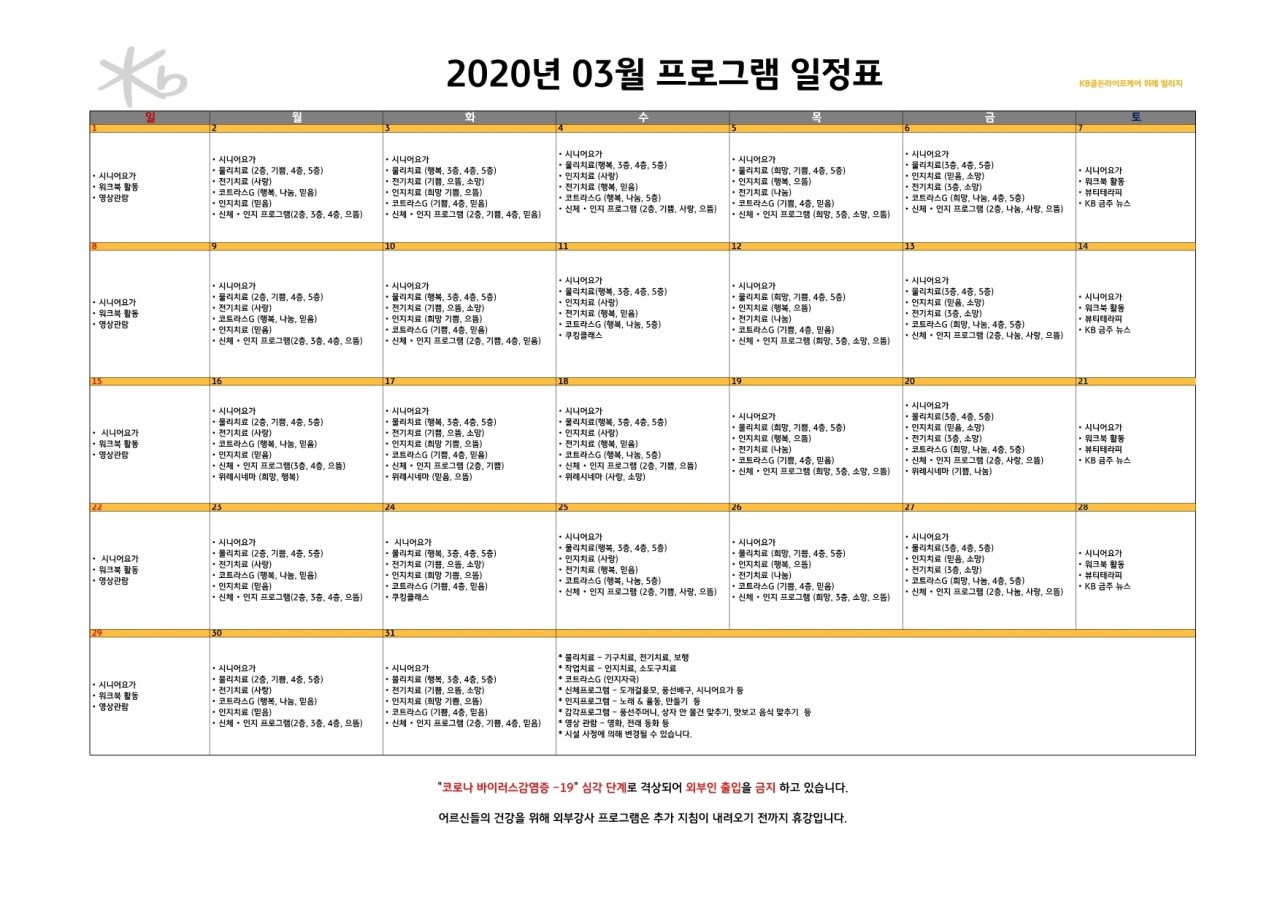 위례빌리지 [프로그램 안내] 2020년 위례 빌리지 03월 프로그램 일정표 페이지 정보 작성자 KB 골든라이프 댓글 0건 조회 4,079회 작성일 20-03-03 09:16 목록 본문 목록 이전글[프로그램 안내] 2020년 강동케어센터 3월 프로그램 일정표 20.03.03 다음글[식단안내] 위례 케어센터 3월 1주차 식단표 20.02.27