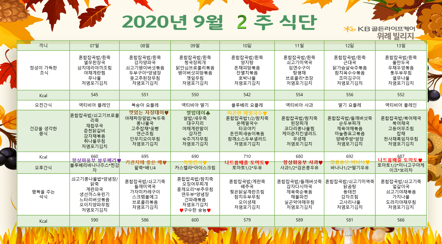 위례빌리지 [식단안내] 위례 빌리지 9월 2주차 식단표 페이지 정보 작성자 KB 골든라이프 댓글 0건 조회 3,690회 작성일 20-09-04 09:27 목록 본문 목록 이전글[식단안내] 위례 케어센터 9월 2주차 식단표 20.09.04 다음글[프로그램 안내] 2020년 위례 빌리지 9월 프로그램 일정표 20.09.03