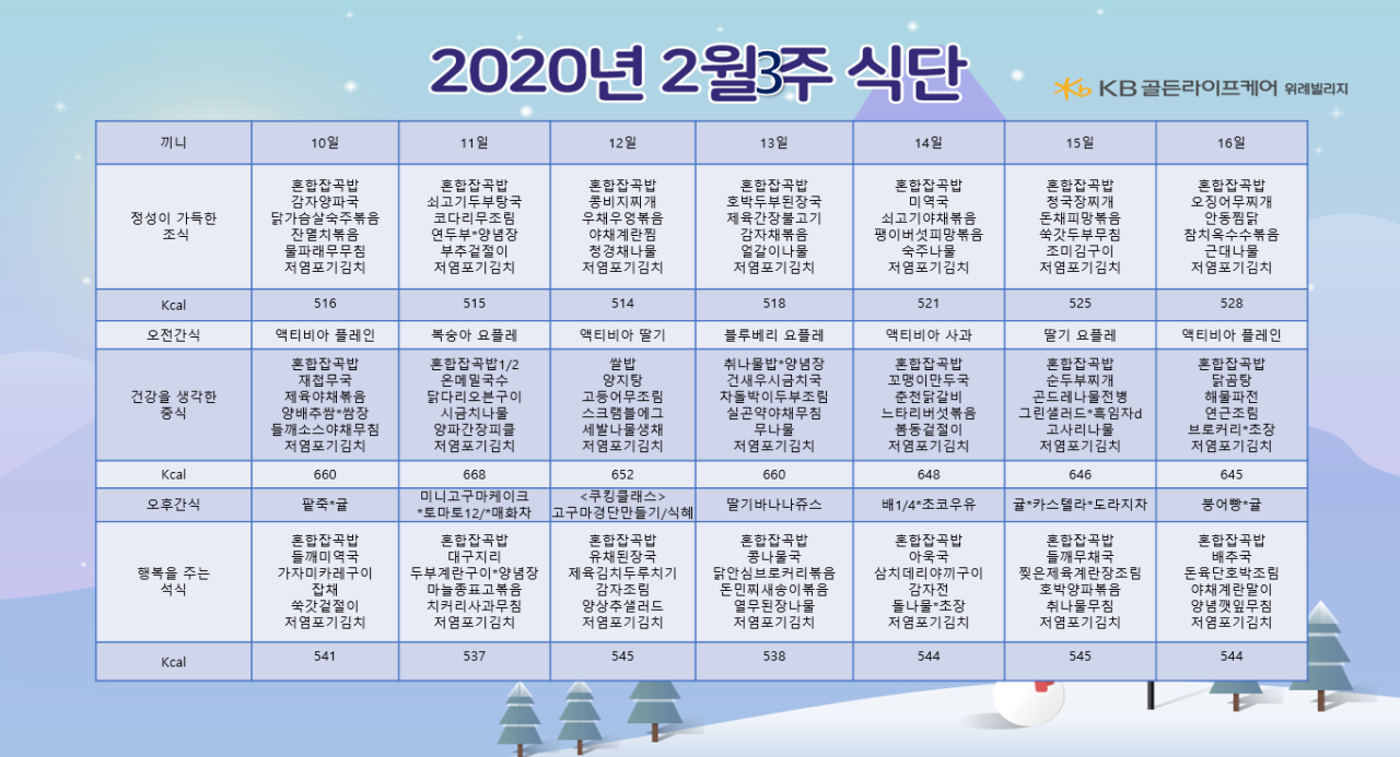 위례빌리지 [식단안내] 위례빌리지 2월 3주차 식단표 페이지 정보 작성자 KB 골든라이프 댓글 0건 조회 3,590회 작성일 20-02-06 11:33 목록 본문 목록 이전글[식단안내] 위례케어센터 2월 3주차 식단표 20.02.06 다음글[프로그램 안내] 2020년 강동케어센터 2월 프로그램 일정표 20.02.04