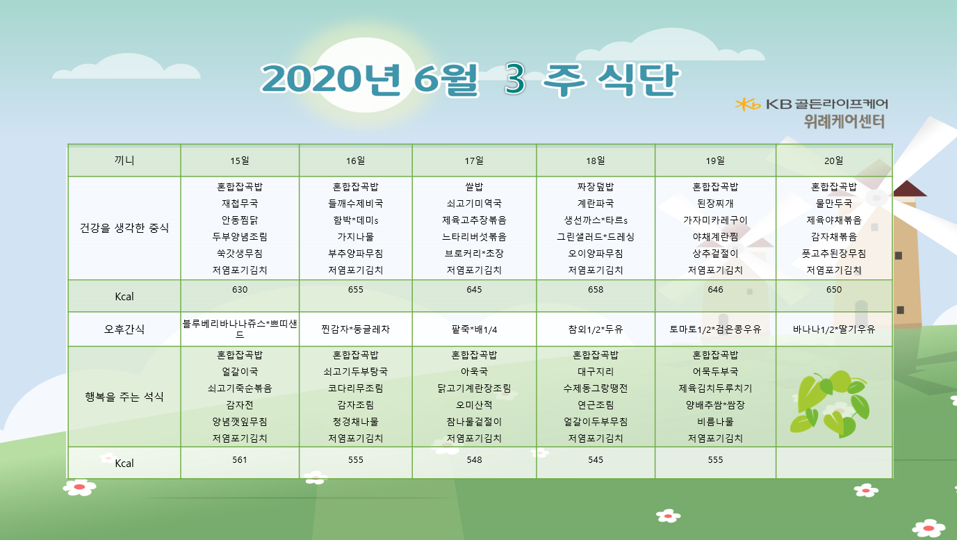 위례케어센터 [식단안내] 위례 케어센터 6월 3주차 식단표 페이지 정보 작성자 KB 골든라이프 댓글 0건 조회 3,862회 작성일 20-06-12 10:07 목록 본문 목록 이전글[식단안내] 위례 빌리지 6월 4주차 식단표 20.06.19 다음글[식단안내] 위례 빌리지 6월 3주차 식단표 20.06.12