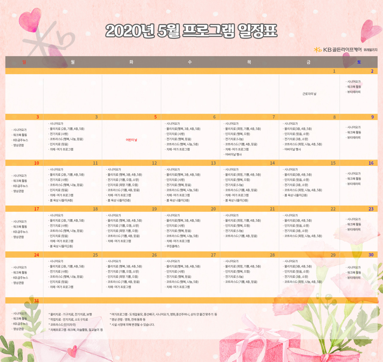 위례빌리지 [프로그램 안내] 2020년 위례 빌리지 5월 프로그램 일정표 페이지 정보 작성자 KB 골든라이프 댓글 0건 조회 4,320회 작성일 20-05-04 14:43 목록 본문 목록 이전글[식단안내] 강동케어센터 2020년 5월 식단표 20.05.07 다음글[식단안내] 위례 케어센터 5월 2주차 식단표 20.04.29
