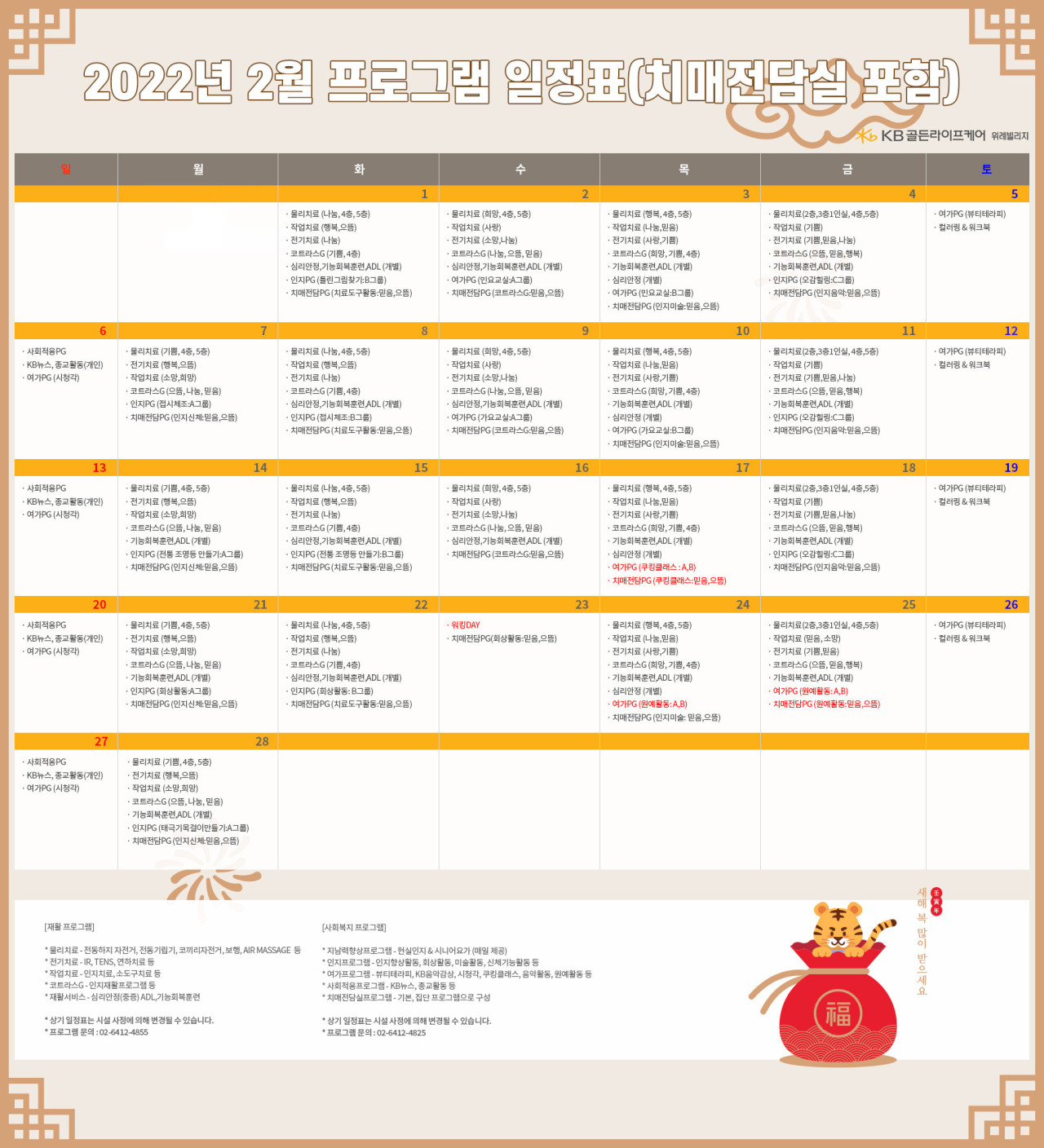 위례빌리지 [프로그램 안내] 2022년 위례 빌리지 2월 프로그램 일정표 페이지 정보 작성자 KB 골든라이프케어 댓글 0건 조회 3,232회 작성일 22-01-31 09:03 목록 본문 목록 이전글[프로그램 안내] 2022년 강동케어센터 2월 프로그램 22.02.03 다음글[프로그램 안내] 2022년 서초 빌리지 2월 프로그램 일정표 22.01.30