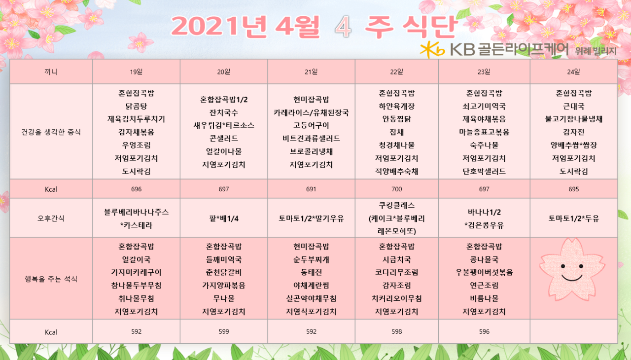 위례빌리지 [식단안내] 위례 빌리지 4월 4주차 식단표 페이지 정보 작성자 KB 골든라이프케어 댓글 0건 조회 3,676회 작성일 21-04-16 15:21 목록 본문 목록 이전글[식단안내] 위례 케어센터 4월 4주차 식단표 21.04.16 다음글 21.04.23