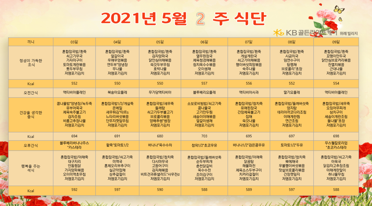 위례빌리지 [식단안내] 위례 빌리지 5월 2주차 식단표 페이지 정보 작성자 KB 골든라이프케어 댓글 0건 조회 3,231회 작성일 21-04-30 15:17 목록 본문 목록 이전글[식단안내] 위례 케어센터 5월 2주차 식단표 21.04.30 다음글[프로그램 안내] 2021년 위례 케어센터 5월 프로그램 일정표 21.04.30