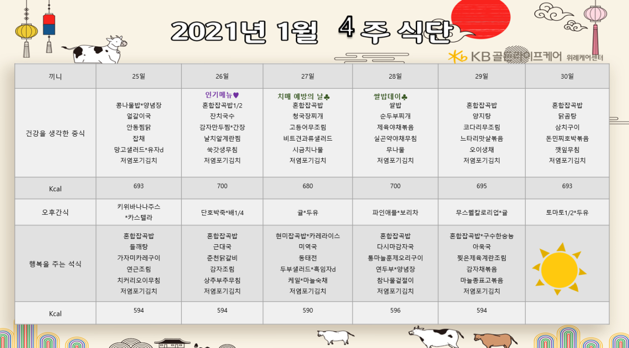위례케어센터 [식단안내] 위례 케어센터 1월 4주차 식단표 페이지 정보 작성자 KB 골든라이프케어 댓글 0건 조회 3,316회 작성일 21-01-21 18:13 목록 본문 목록 이전글[식단 안내] 2021년 강동케어센터 2월 식단표 21.01.27 다음글[식단안내] 위례 빌리지 1월 4주차 식단표 21.01.21