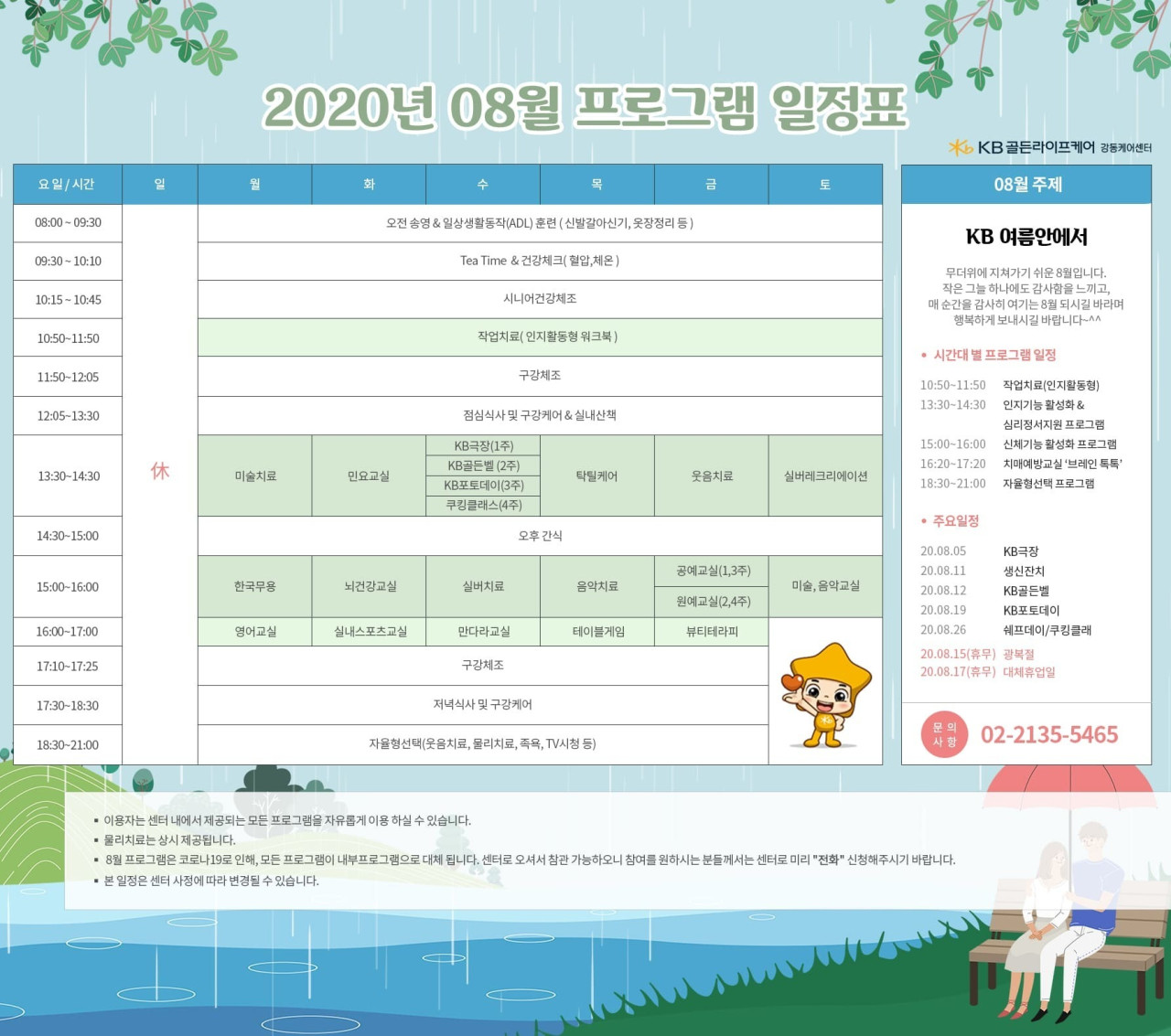 강동케어센터 [프로그램 안내] 2020년 강동케어센터 8월 프로그램 페이지 정보 작성자 KB 골든라이프 댓글 0건 조회 3,791회 작성일 20-08-01 13:30 목록 본문 목록 이전글[식단 안내] 2020년 강동케어센터 8월 식단표 20.08.01 다음글[식단안내] 위례 케어센터 8월 2주차 식단표 20.07.31