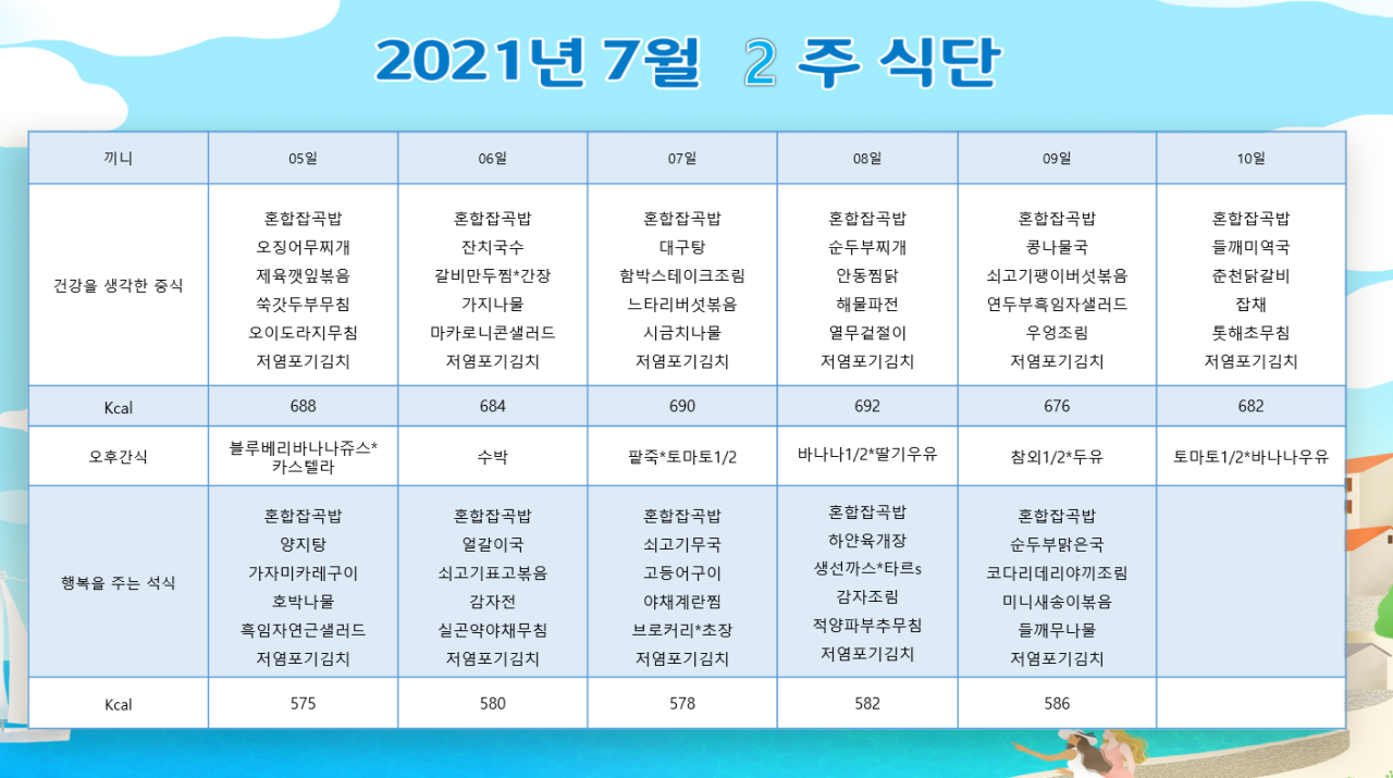위례케어센터 [식단안내] 위례 케어센터 7월 2주차 식단표 페이지 정보 작성자 KB 골든라이프케어 댓글 0건 조회 2,983회 작성일 21-07-02 14:08 목록 본문 목록 이전글[식단안내] 서초빌리지 7월 2주차 식단표 21.07.03 다음글[식단안내] 위례 빌리지 7월2주차 식단표 21.07.02