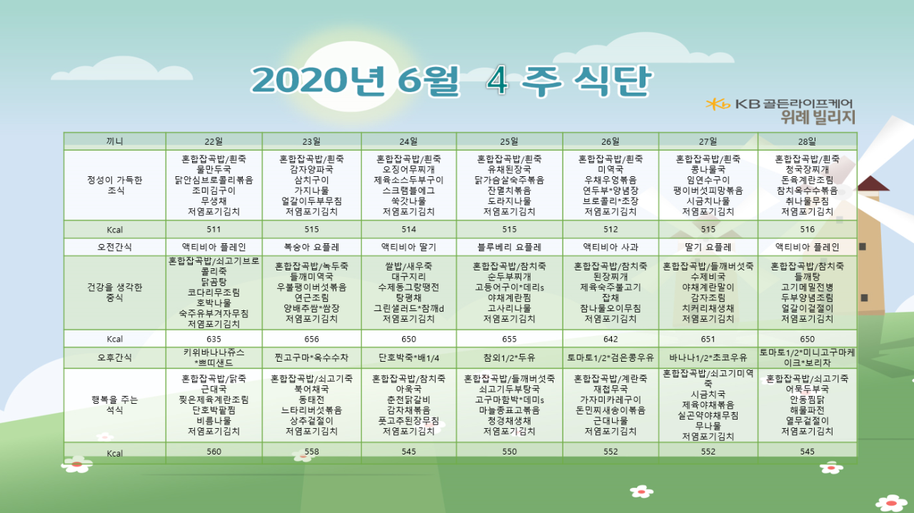 위례빌리지 [식단안내] 위례 빌리지 6월 4주차 식단표 페이지 정보 작성자 KB 골든라이프 댓글 0건 조회 4,050회 작성일 20-06-19 15:35 목록 본문 목록 이전글[식단안내] 위례 케어센터 6월 4주차 식단표 20.06.19 다음글[식단안내] 위례 케어센터 6월 3주차 식단표 20.06.12