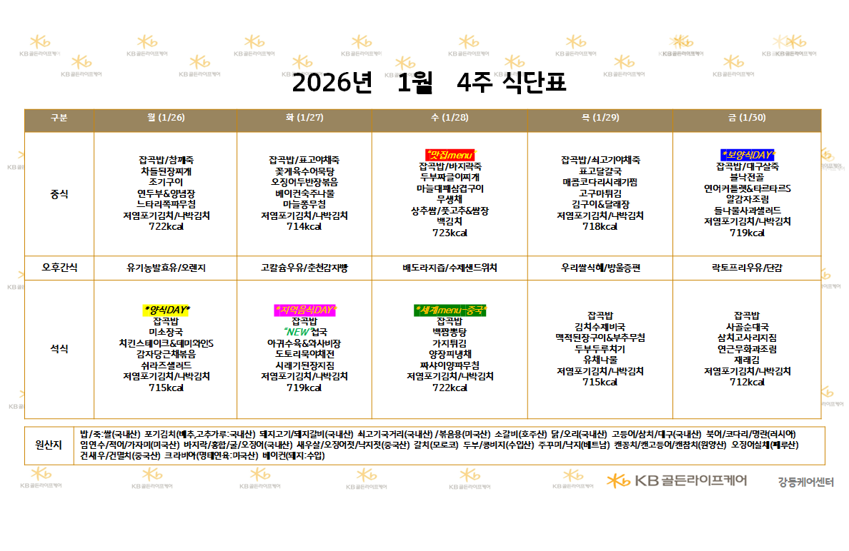 강동케어센터 [식단안내] 2025년 1월 4주 식단표 페이지 정보 작성자 최고관리자 댓글 0건 조회 19회 작성일 26-01-23 16:42 목록 본문 목록 이전글[식단안내] 2026년 1월 4주 식단표 26.01.23 다음글[오늘의 식단] 25년 1월 21일 수요일 중식 26.01.23