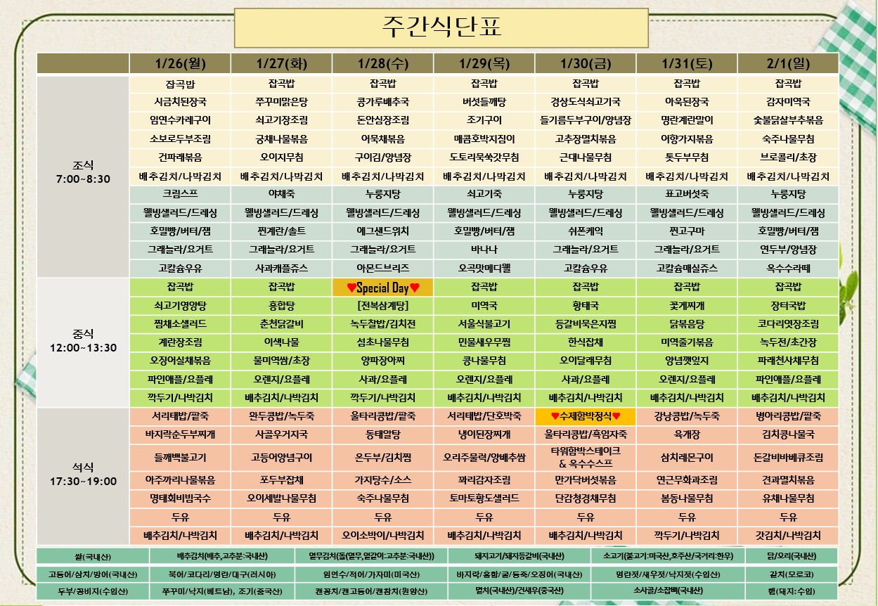 평창카운티 [식단안내] 2026년 1월 4주차 식단표 페이지 정보 작성자 최고관리자 댓글 0건 조회 9회 작성일 26-01-26 02:27 목록 본문 목록 이전글[하루의식단] 2026년 1월 21일 수요일 26.01.27 다음글[하루의 식단] 2026년 1월 21일 (조/중/석) 26.01.26