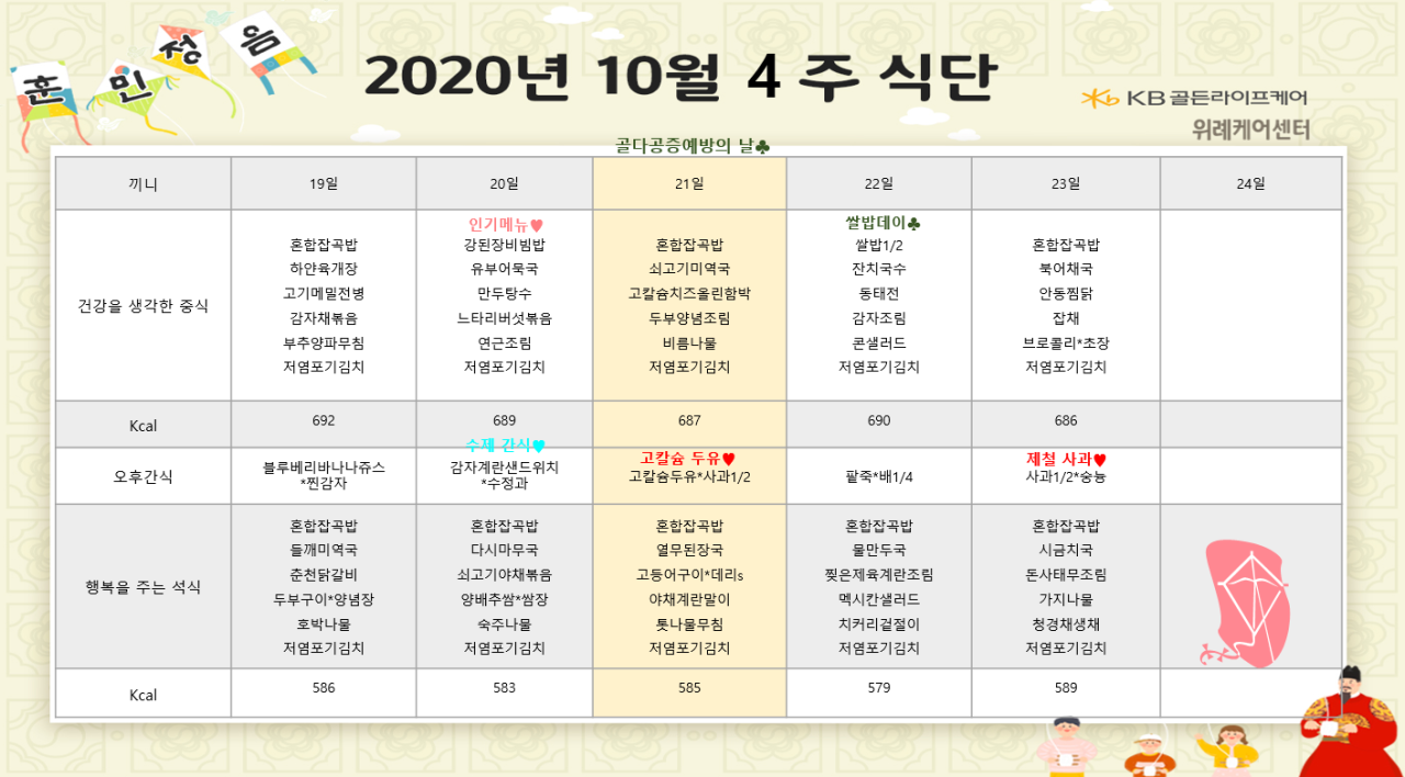 위례케어센터 [식단안내] 위례 케어센터 10월 4주차 식단표 페이지 정보 작성자 KB 골든라이프 댓글 0건 조회 3,799회 작성일 20-10-15 13:12 목록 본문 목록 이전글[식단안내] 위례 빌리지 10월 5주차 식단표 20.10.22 다음글[식단안내] 위례 빌리지 10월 4주차 식단표 20.10.15