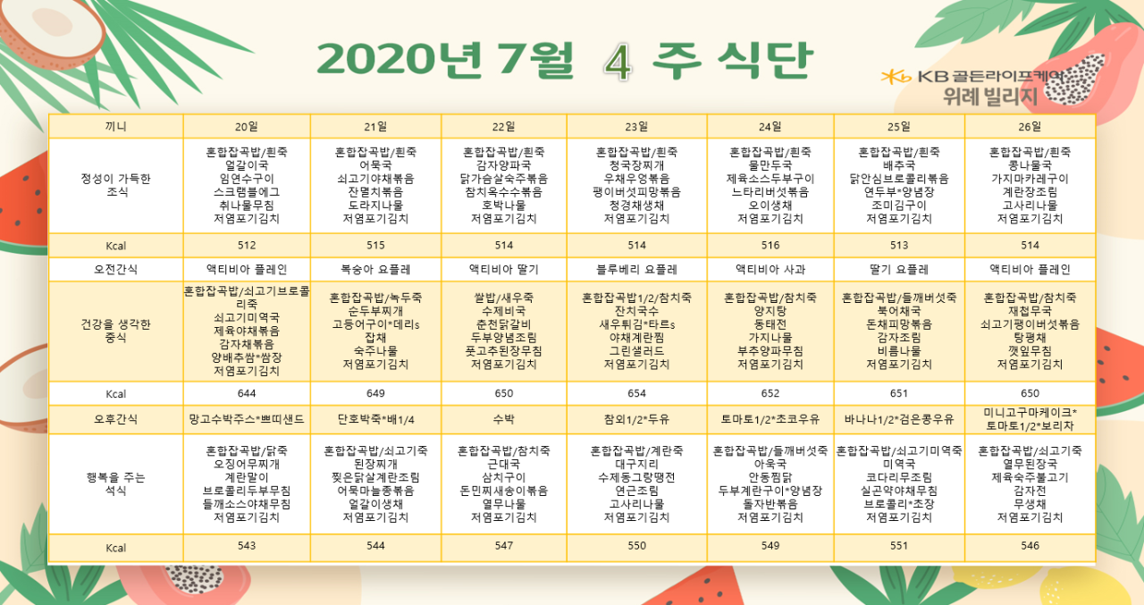 위례빌리지 [식단안내] 위례 빌리지 7월 4주차 식단표 페이지 정보 작성자 KB 골든라이프 댓글 0건 조회 4,088회 작성일 20-07-16 15:54 목록 본문 목록 이전글[식단안내] 위례 케어센터 7월 4주차 식단표 20.07.16 다음글[식단안내] 위례 케어센터 7월 3주차 식단표 20.07.10