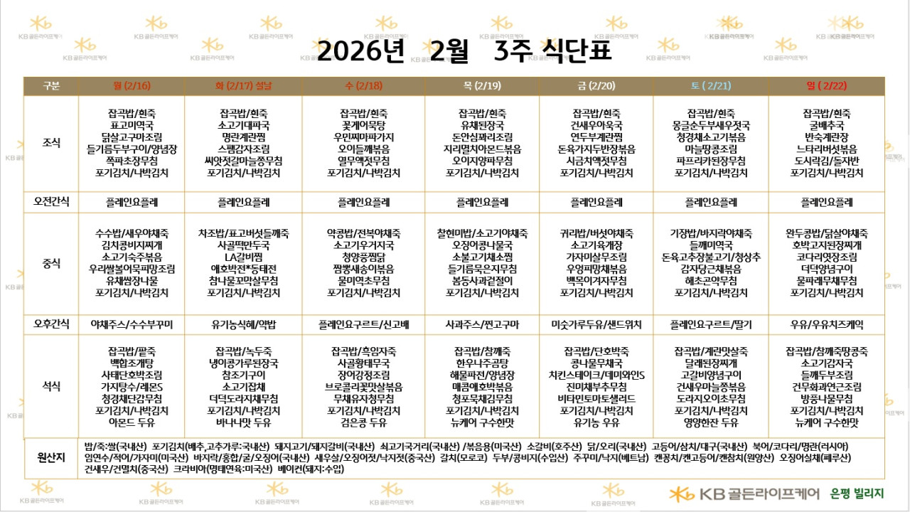 은평빌리지 [식단안내] 2026년 2월 3주차 식단표 페이지 정보 작성자 최고관리자 댓글 0건 조회 157회 작성일 26-02-14 15:26 목록 본문 목록 이전글[오늘의식단] 2026년 2월 10일 중식 26.02.14 다음글[하루의식단] 2026년 2월 13일 조/중/석식 26.02.14