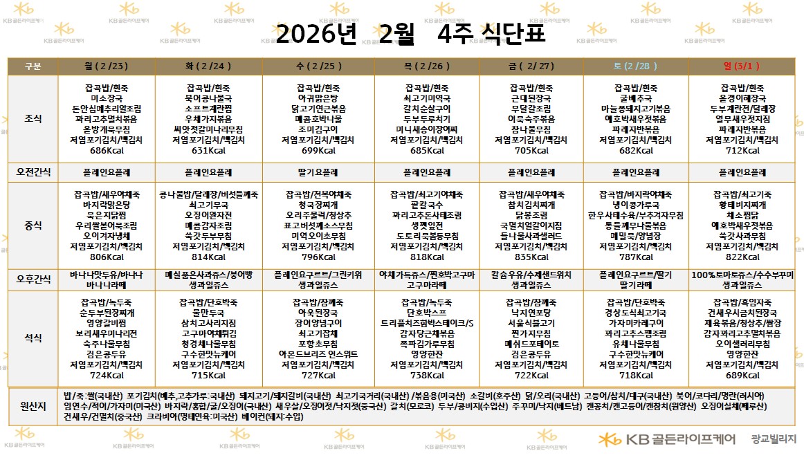 광교빌리지 [식단안내] 2026년 2월 4주 식단표 페이지 정보 작성자 최고관리자 댓글 0건 조회 45회 작성일 26-02-20 16:45 목록 본문 목록 이전글[하루의 식단]강동빌리지 2월 16일 월요일 26.02.20 다음글[하루의 식단] 2026년 2월 17일 26.02.20