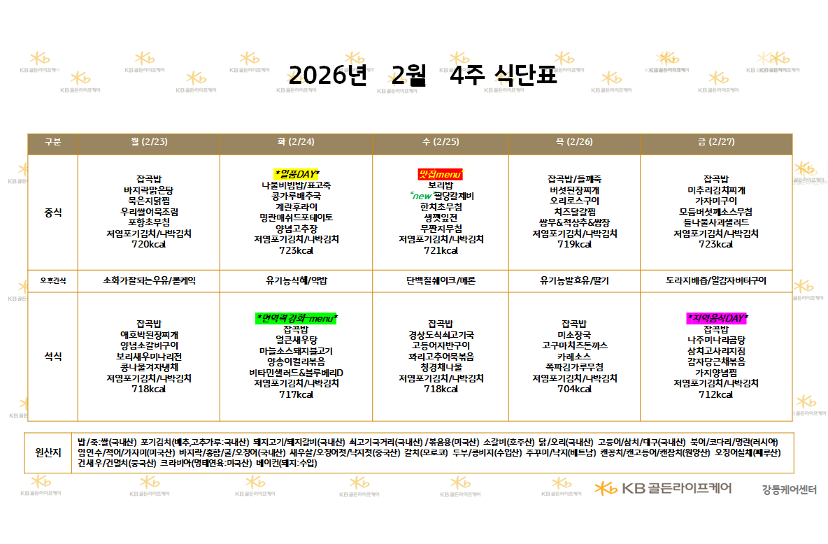 강동케어센터 [식단안내] 2025년 2월 4주 식단표 페이지 정보 작성자 최고관리자 댓글 0건 조회 15회 작성일 26-02-20 16:56 목록 본문 목록 이전글[오늘의 식단] 25년 2월 19일 목요일 중식 26.02.20 다음글[식단안내] 2026년 2월 4주 식단표 26.02.20