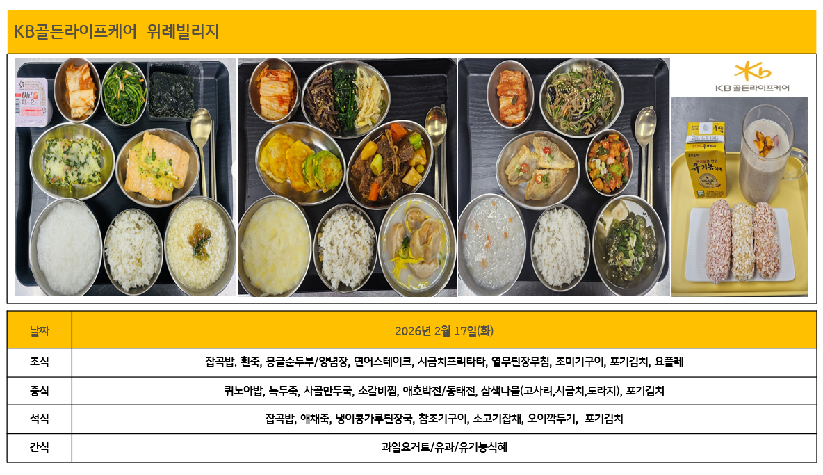 위례빌리지 [하루의 식단] 2026년 2월 17일 페이지 정보 작성자 최고관리자 댓글 0건 조회 23회 작성일 26-02-22 14:36 목록 본문 목록 이전글[식단안내] 2026년 2월 4주차 식단표 26.02.22 다음글[식단안내] 2026년 2월 4주차 식단표 26.02.21