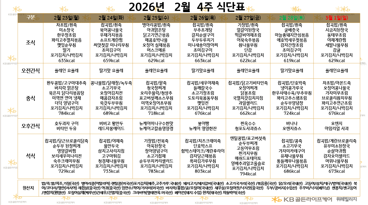 위례빌리지 [식단안내] 2026년 2월 4주차 식단표 페이지 정보 작성자 최고관리자 댓글 0건 조회 41회 작성일 26-02-22 14:39 목록 본문 목록 이전글[프로그램 안내]2026년 강동 빌리지 3월 프로그램 일정표 26.02.25 다음글[식단안내] 2026년 2월 4주차 식단표 26.02.22