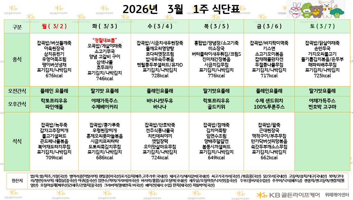 위례케어센터 [식단안내] 2026년 3월 1주차 식단표 페이지 정보 작성자 최고관리자 댓글 0건 조회 8회 작성일 26-02-26 16:42 목록 본문 목록 이전글[식단안내] 2026년 3월 1주차 식단표 26.02.26 다음글[프로그램 안내]2026년 위례 빌리지 3월 프로그램 일정표 26.02.26