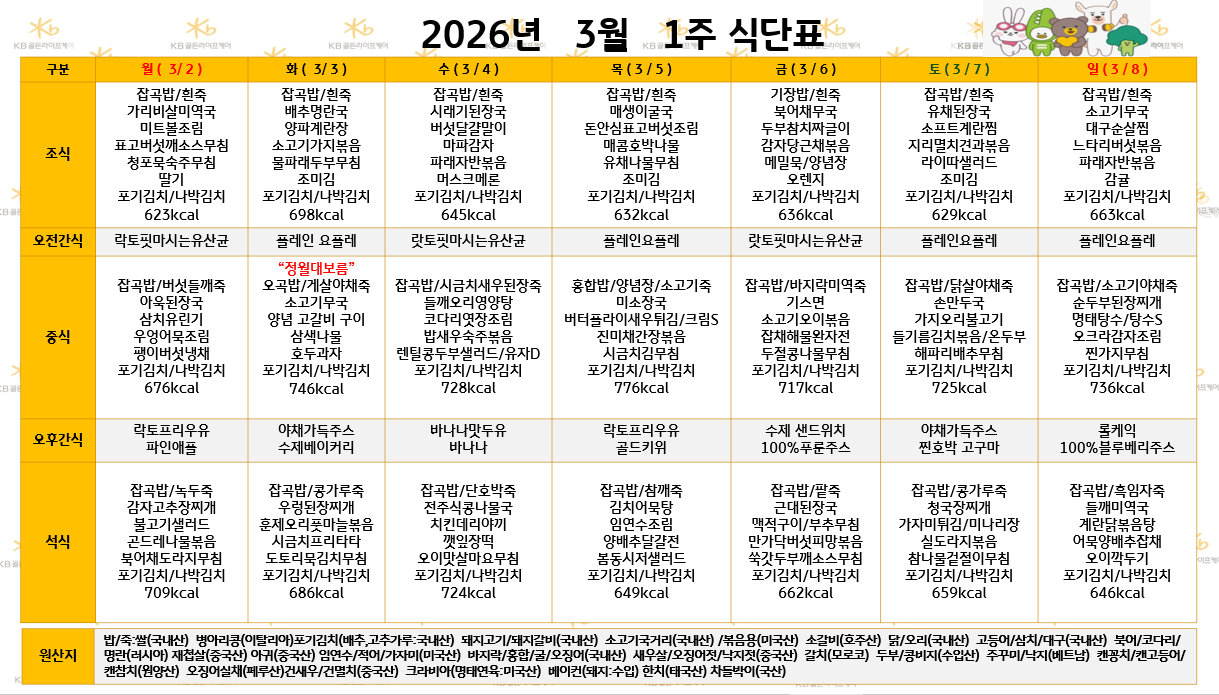 위례빌리지 [식단안내] 2026년 3월 1주차 식단표 페이지 정보 작성자 최고관리자 댓글 0건 조회 16회 작성일 26-02-26 16:43 목록 본문 목록 이전글[프로그램 안내] 2026년 서초 빌리지 3월 프로그램 일정표 26.02.27 다음글[식단안내] 2026년 3월 1주차 식단표 26.02.26